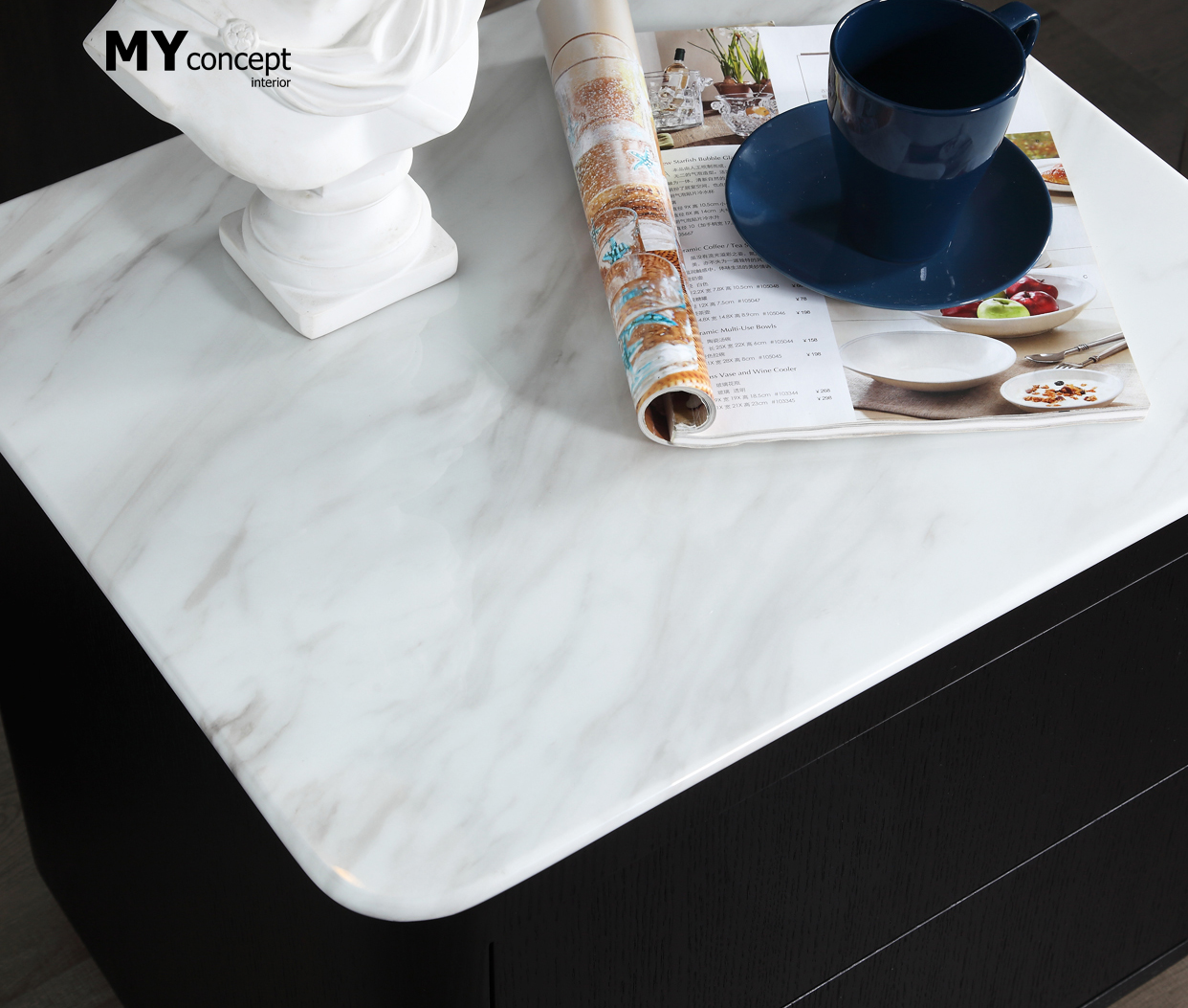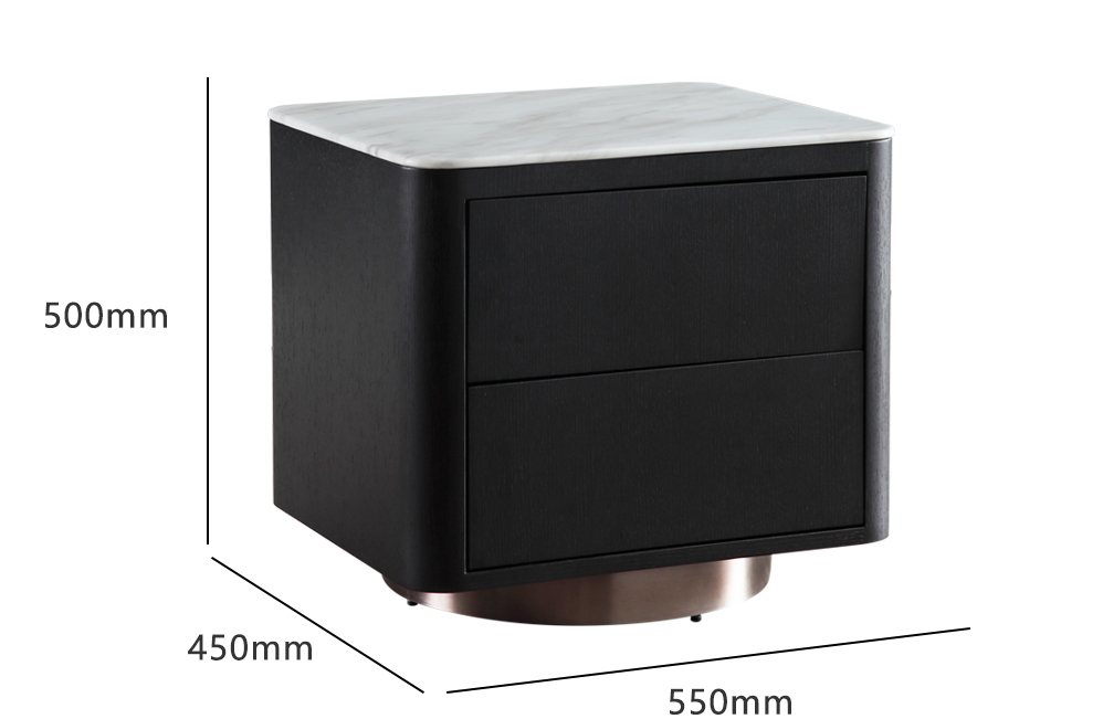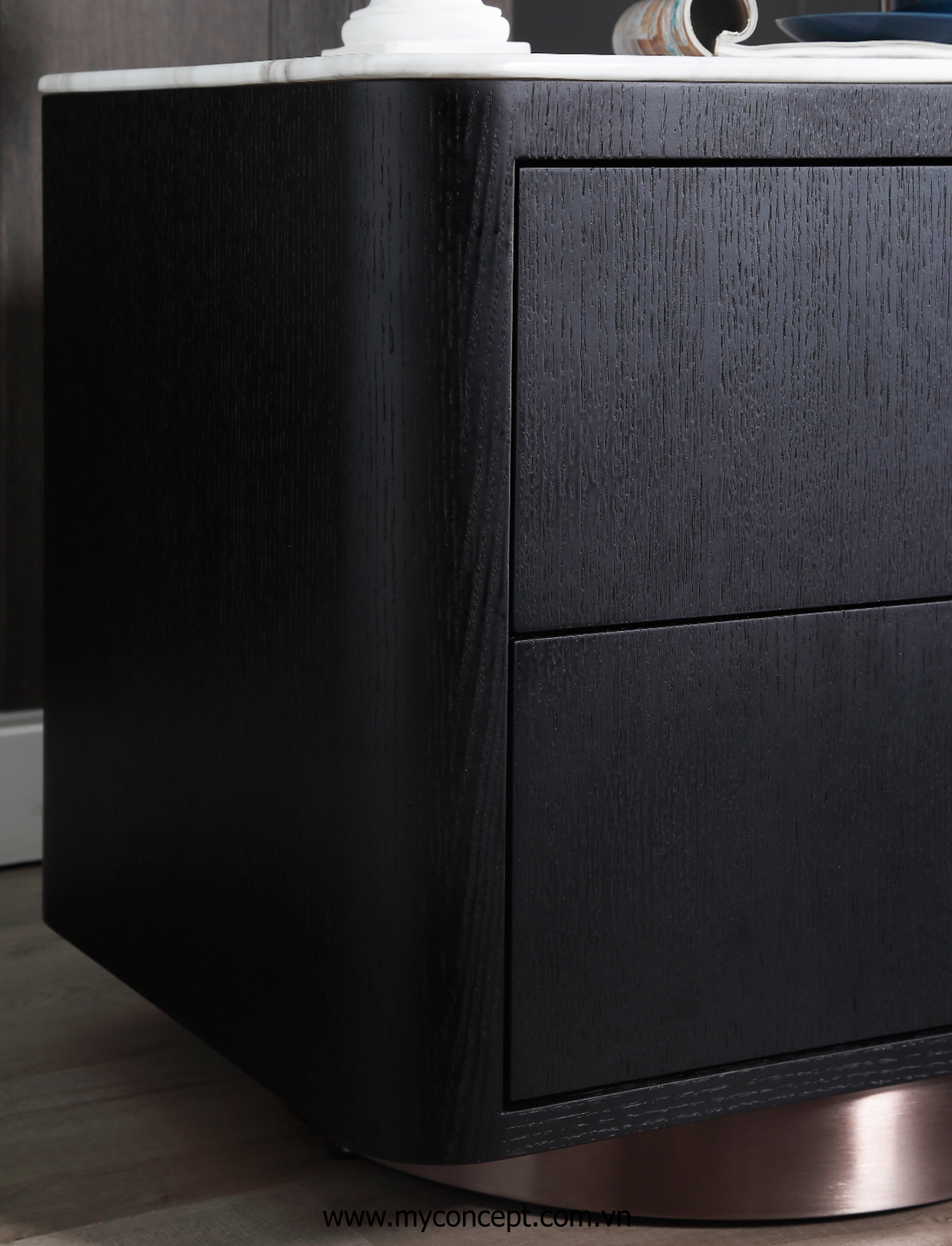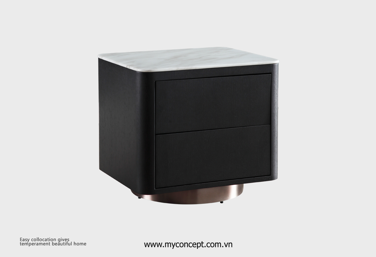 Chất liệu: Gỗ sồi Nga, phủ veneer, mặt đá cẩm thạch tự nhiên, chân thép mạ đồng