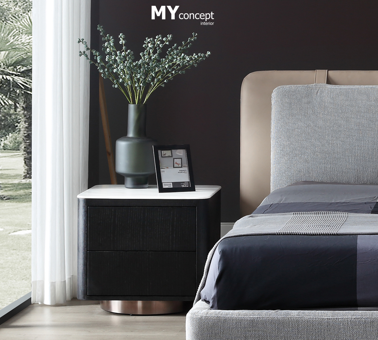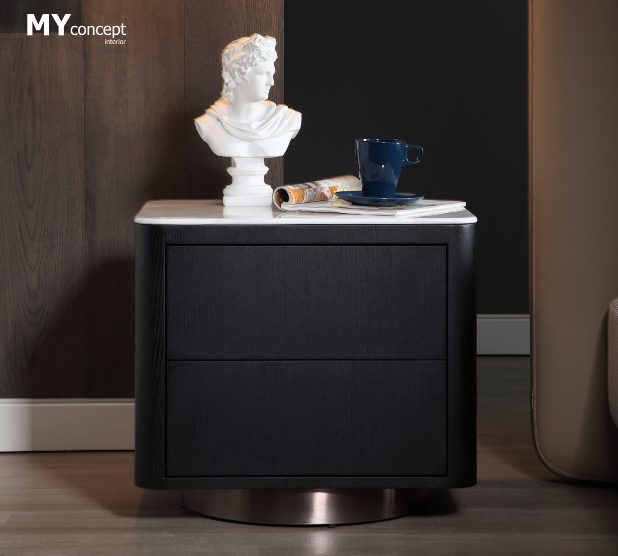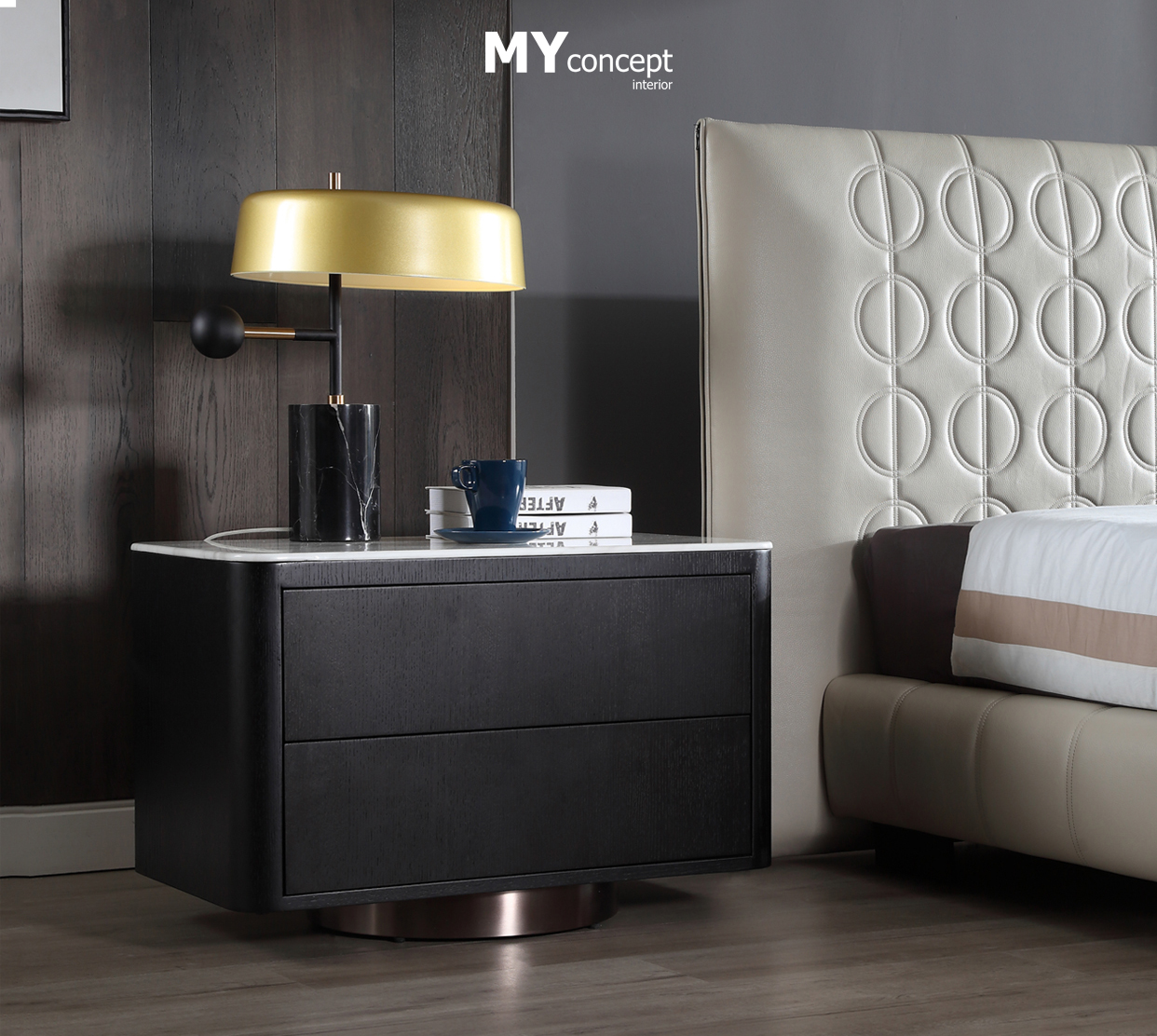 Chất liệu: Gỗ sồi Nga, phủ veneer, mặt đá cẩm thạch tự nhiên, chân thép mạ đồng